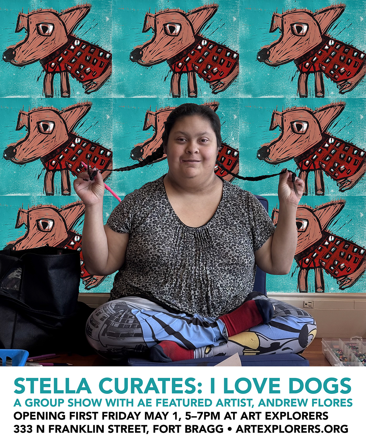 Join us this First Friday in May at the Art Explorers studio for Stella Curates: I Love Dogs, featuring artwork by the month’s selected artist, Andrew Flores.